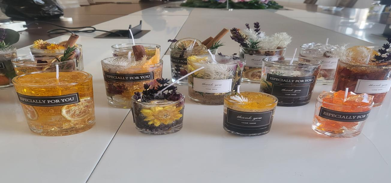 大家充分發(fā)揮創(chuàng)造力,經(jīng)過(guò)近一個(gè)小時(shí)的精心制作,一份份獨(dú)特的、充滿(mǎn)創(chuàng)意的香薰蠟燭完美的展現(xiàn)在我們面前。作品中香薰造型各異,也代表著大家不同的心境與體驗(yàn),鮮亮的橙色、清新的綠色、淡雅的白色,花立于杯中,或安靜或?yàn)⒚摚o人以美的享受。